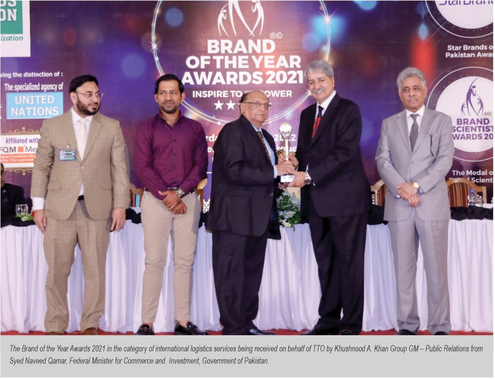 Maintaining its seamless record 'The TAQ Organization' once again received the honour of being the winner of Brand of the Year Awards 2021 in the category of international logistics services at a grand ceremony held on July 30, 2022 at Pearl Continental Hotel Karachi. The award presented by Federal Minister for Commerce and Investment, Government of Pakistan, Syed Naveed Qamar, was received on behalf of TTO by its Executive Director Public Relations Khushnood Ahmed Khan.