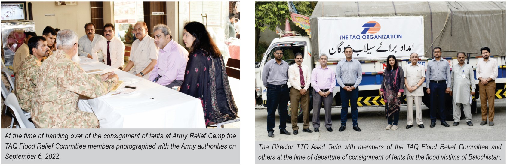 The “TAQ Flood Relief Committee” and “TAQ Flood Relief Fund” were created on the same pattern as was done in the past when the country was affected by calamities like floods and earthquakes. In the message circulated jointly by GM HR and Executive Secretary to the Chairman the TTO staff members were urged to make generous contributions to the fund at this hour of need so that maximum aid could be provided to the flood victims to alleviate their sufferings. An initial substantial personal contribution to the fund came from the Chairman TTO Mian Tariq Mahmud and Directors Ali Tariq and Asad Tariq. In addition, while all TTO and its allied companies participated in the fund by donating a certain amount, some individuals, besides the deduction from their salaries, made notable personal contributions.